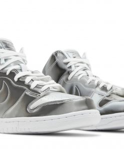 Introducing the CLOT x Nike Dunk High Silver Metallic sneakers by Nike. These limited-edition sneakers combine the signature design of Nike with a sleek silver metallic finish, resulting in a unique and stylish look. With its high-top construction, these sneakers provide excellent ankle support and comfort for everyday wear. Get ready to turn heads with these standout sneakers that perfectly blend fashion and functionality.