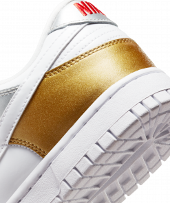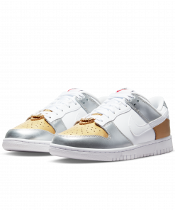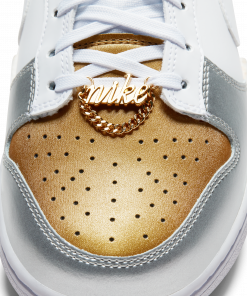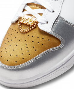 Introducing the Nike Dunk Low SE White Metallic Gold Silver (WMNS). This sneaker combines a sleek white base with eye-catching metallic gold and silver accents. With its iconic silhouette and comfortable fit, this Nike sneaker is perfect for both casual wear and athletic activities. Step up your style game with the Nike Dunk Low SE.